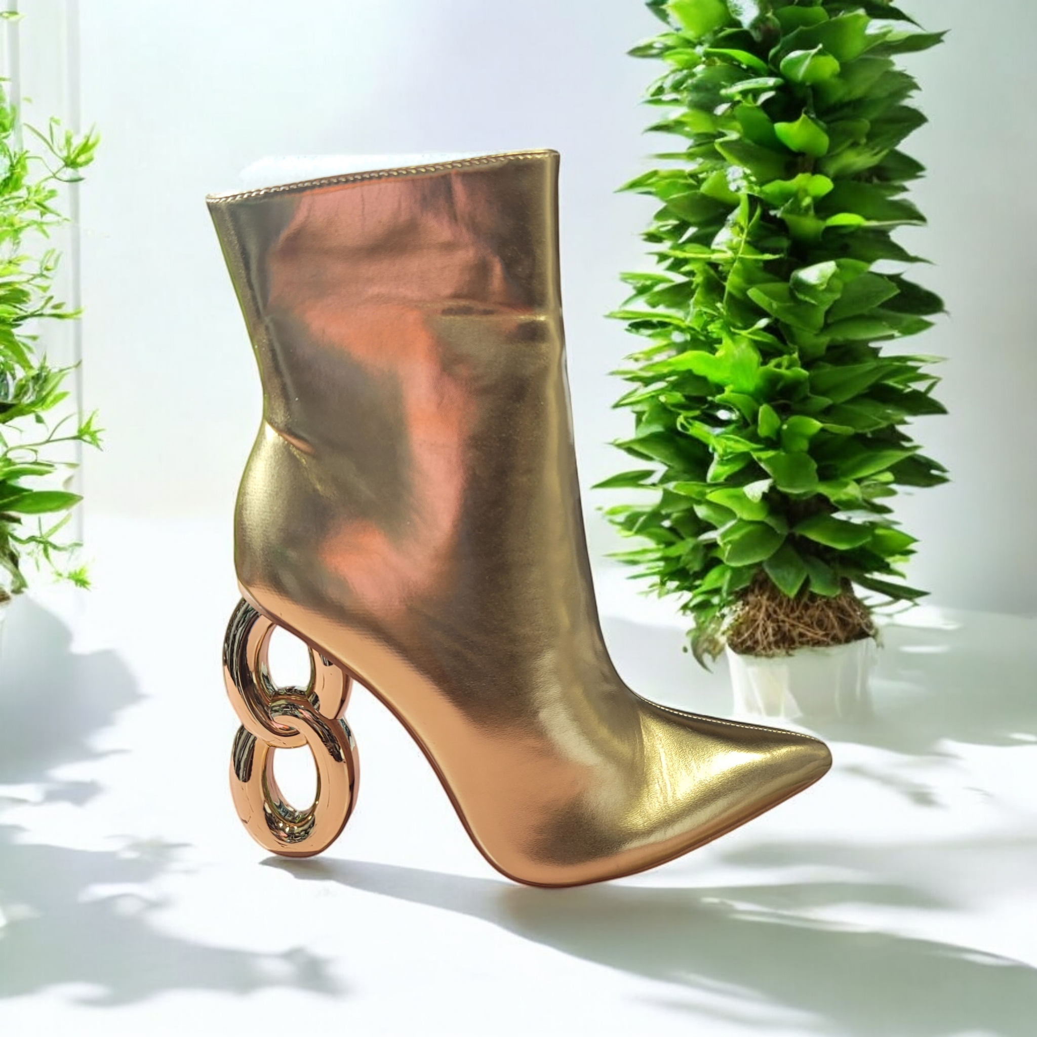 Step into opulence with our exquisite gold boot, a stunning fusion of elegance and boldness. Adorned with a striking chain on the heel, this masterpiece elevates any ensemble, making a statement of luxury and sophistication. Crafted from premium materials, it promises not only style but also comfort, ensuring you walk with confidence and grace. Perfect for the discerning fashionista, this boot is a must-have for those who dare to shine.